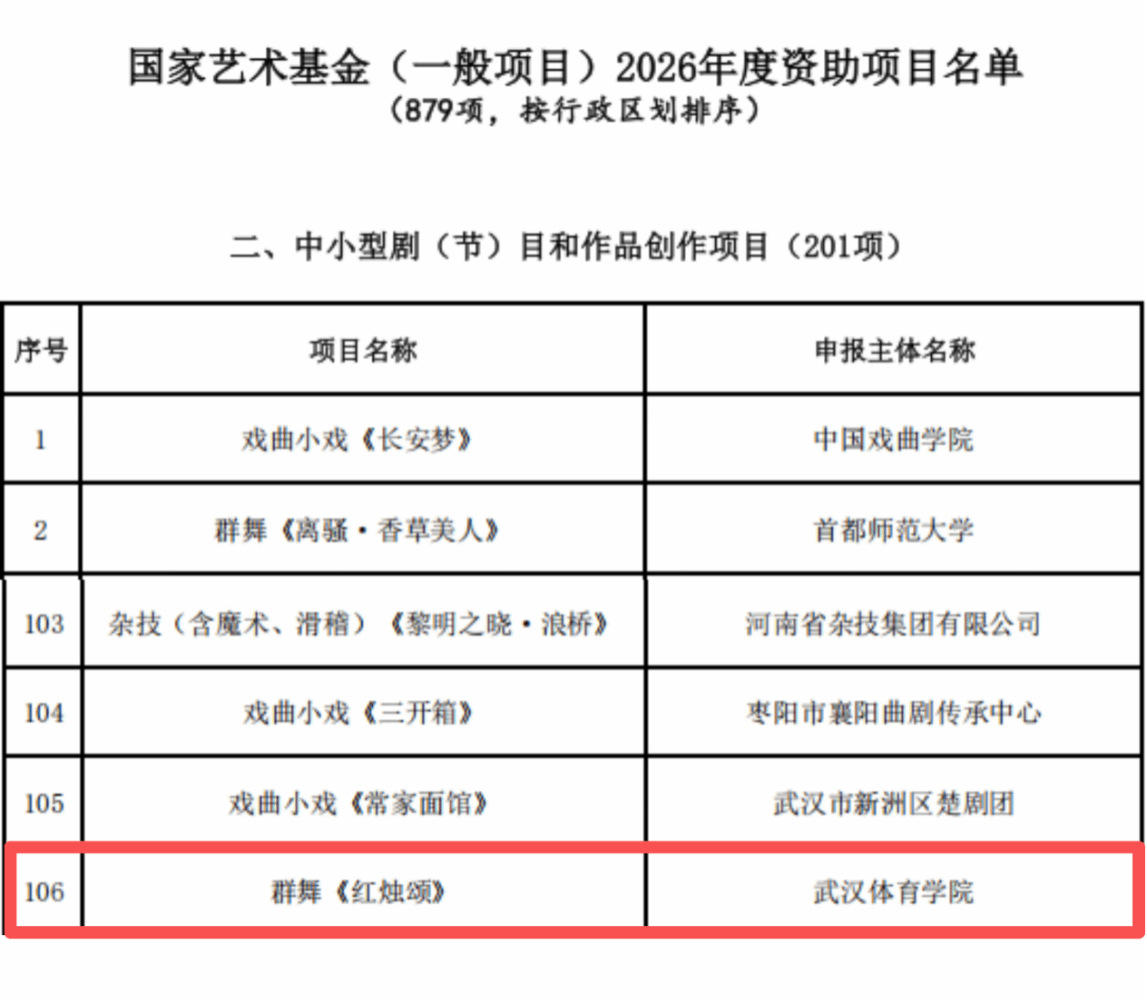 新闻网讯(通讯员安谱洁)近日,国家艺术基金2026年度资助项目名单正式公布,艺术学院谢迟副教授申报的中小型剧(节)目和作品创作项目——原创群舞《红烛颂》成功入选,实现了学校在国家艺术基金立项的突破。