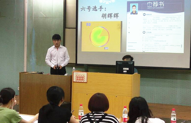 12日晚7点,活动准时拉开帷幕,首先进行的是本次比赛的第一个环节“魅力登场”,要求选手们在5分钟的时间内将自己的学历背景、相关实践经验以及应聘岗位做一个系统的介绍。在接下来的“身临其境”环节要求选手上台抽取情景题目,随后开始作答,时间为2分钟,评委根据选手的言行举止、应变能力和处理结果,给出分数。比赛现场,评委们还从专业知识、职业规划等方面向参加模拟招聘人员灵活提问,选手们自信、精彩的自我展示,机智、灵敏、流畅的应答赢得了全场同学们的热烈掌声和评委们的一致好评。