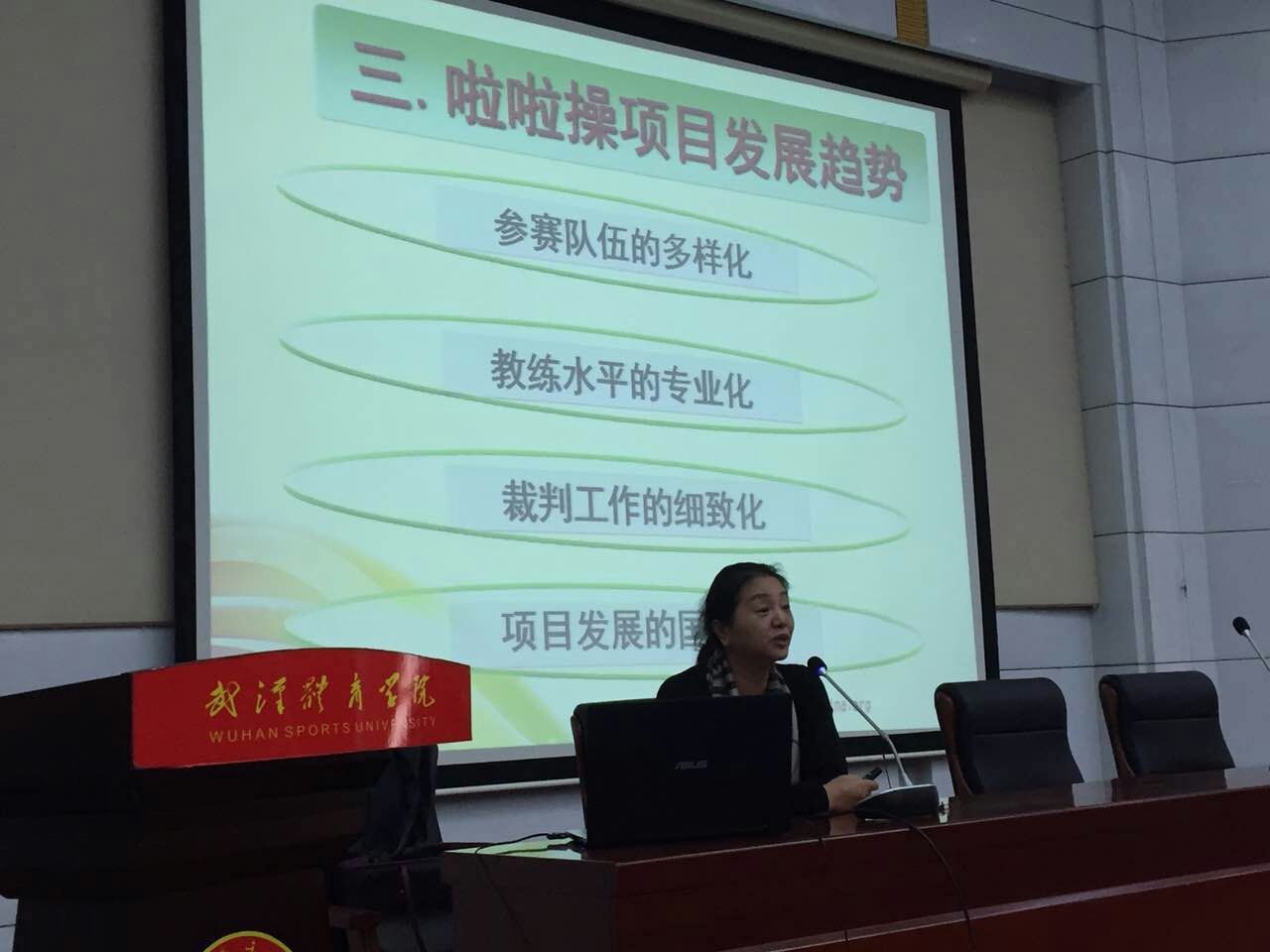 开班典礼结束,由我校健美操啦啦操学科带头人李卫东教授讲课,重点围绕国内啦啦操运动的发展现状与趋势,针对我省发展现状,李卫东教授做了详细的分析汇报。