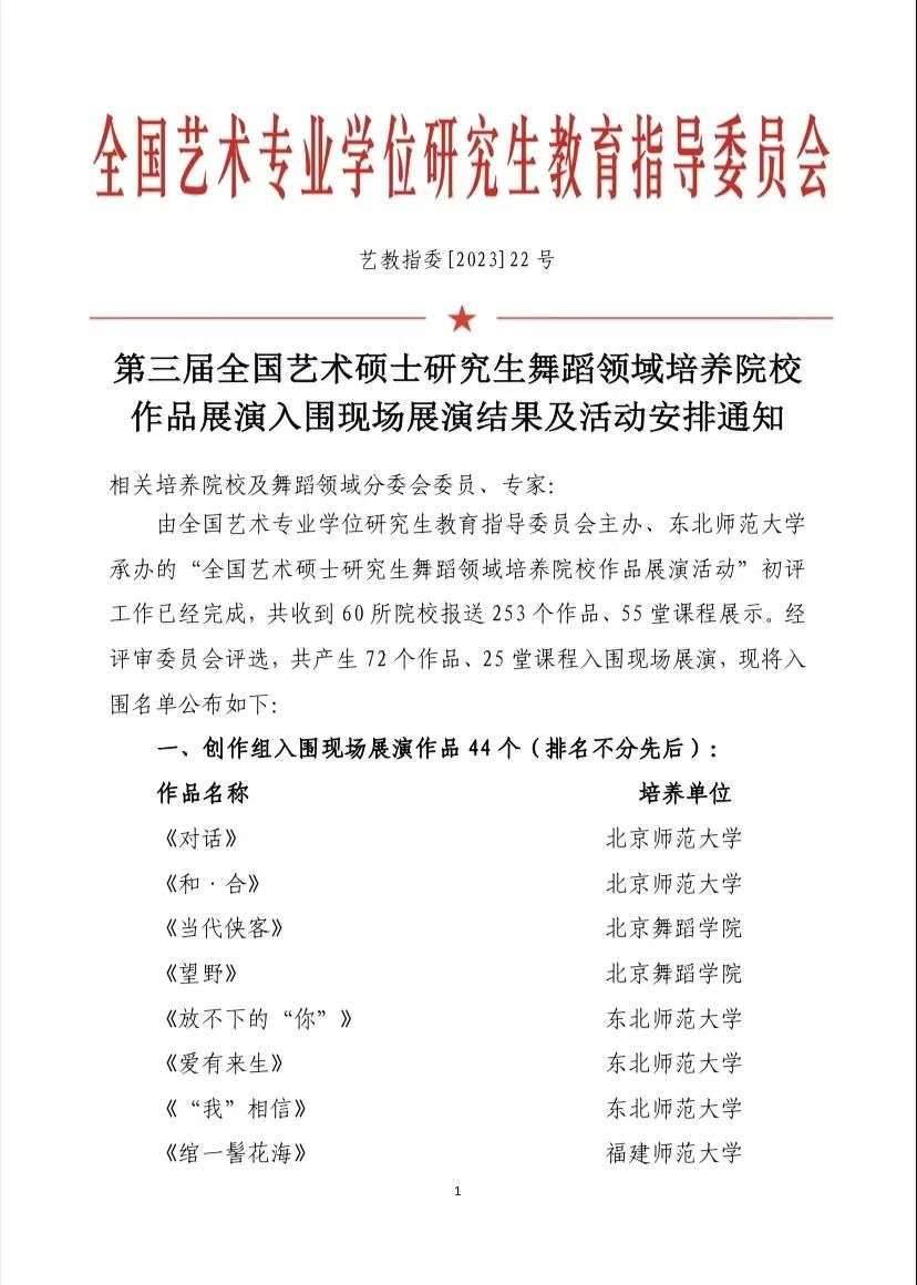新闻网讯(通讯员范玉斌)2023年11月2日至5日,由全国艺术专业学位研究生教育指导委员会主办的“第三届全国艺术硕士研究生舞蹈领域培养院校作品展演活动”在东北师范大学举行。该展演以展示艺术专业学位研究生舞蹈作品为目的,充分挖掘艺术硕士研究生的创作与表演潜力,推出新人新作,搭建交流平台,促进多元互动,以此提高艺术硕士的创新能力、表演能力、实践能力。此次展演共收到60所院校报送253个作品、55 堂课程展示。