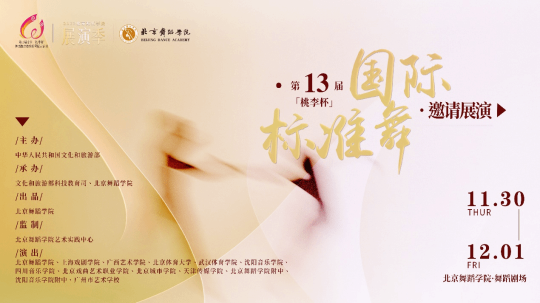 2023年11月30日-12月1日,由中华人民共和国文化和旅游部主办,文化和旅游部科技教育司、北京舞蹈学院承办的第十三届“桃李杯”全国青少年舞蹈教育教学成果展示活动——国际标准舞邀请展演,在北京舞蹈学院舞蹈剧场顺利举行。本次“桃李杯”舞蹈展演不仅是展示舞蹈技巧和表演才华的平台,也为促进舞蹈教育和艺术交流提供重要途径。