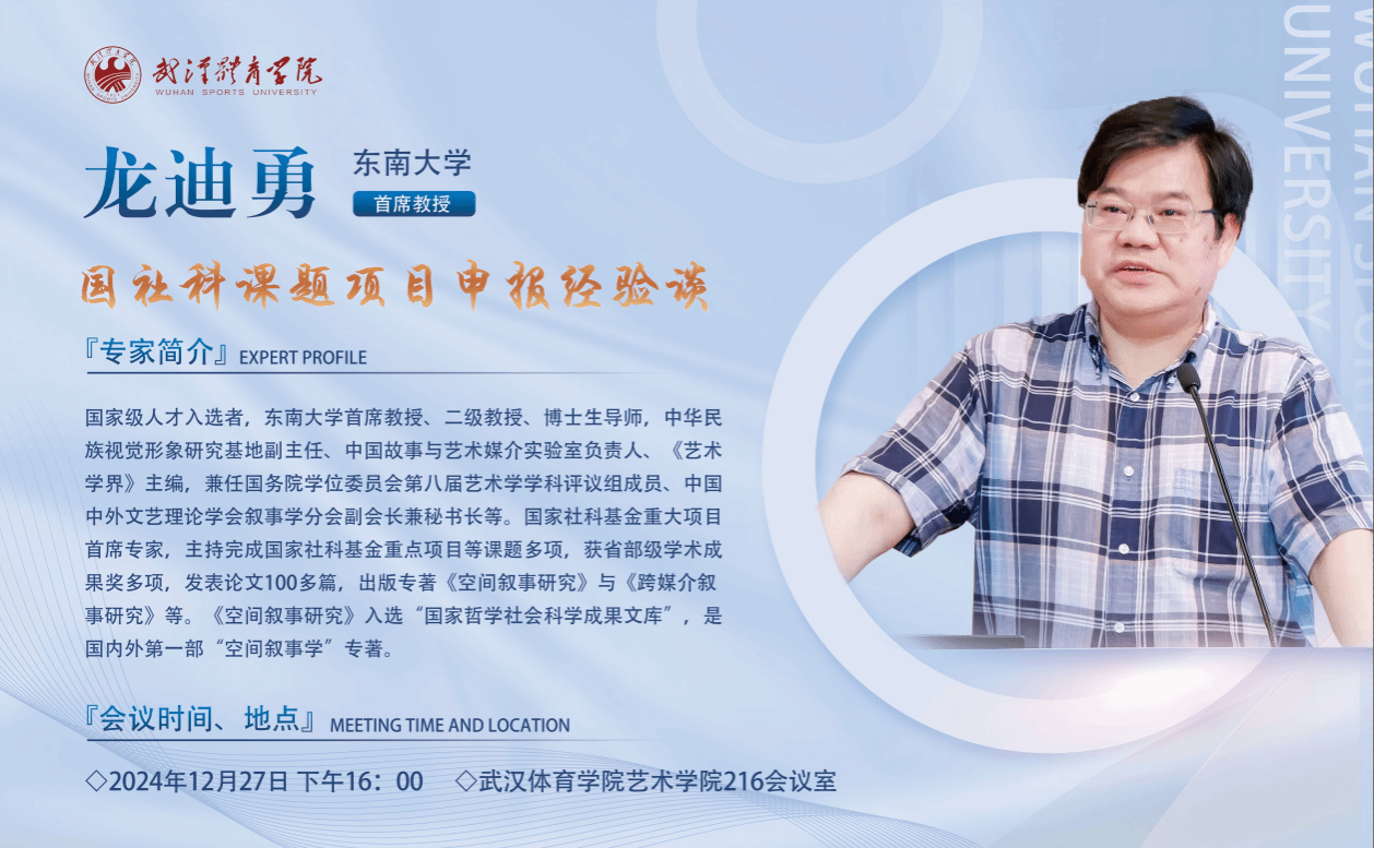 新闻网讯(通讯员冷雪儿)为紧密配合学校关于国家级科研项目预申报的部署,致力于显著提高我院在国家级项目申报方面的整体表现,并确保整个申报流程顺利高效,进一步提高国家级申报质量,推动学术研究与艺术创作的深度融合,12月27日下午,我院特别荣幸地邀请到了文学博士、东南大学首席教授、博士生导师龙迪勇老师,为我院教师开展“国社科课题项目申报经验谈”国家科研课题申报指导讲座。艺术学院院长、各教研室主任、书记、教学秘书及全体预申报教师参会。