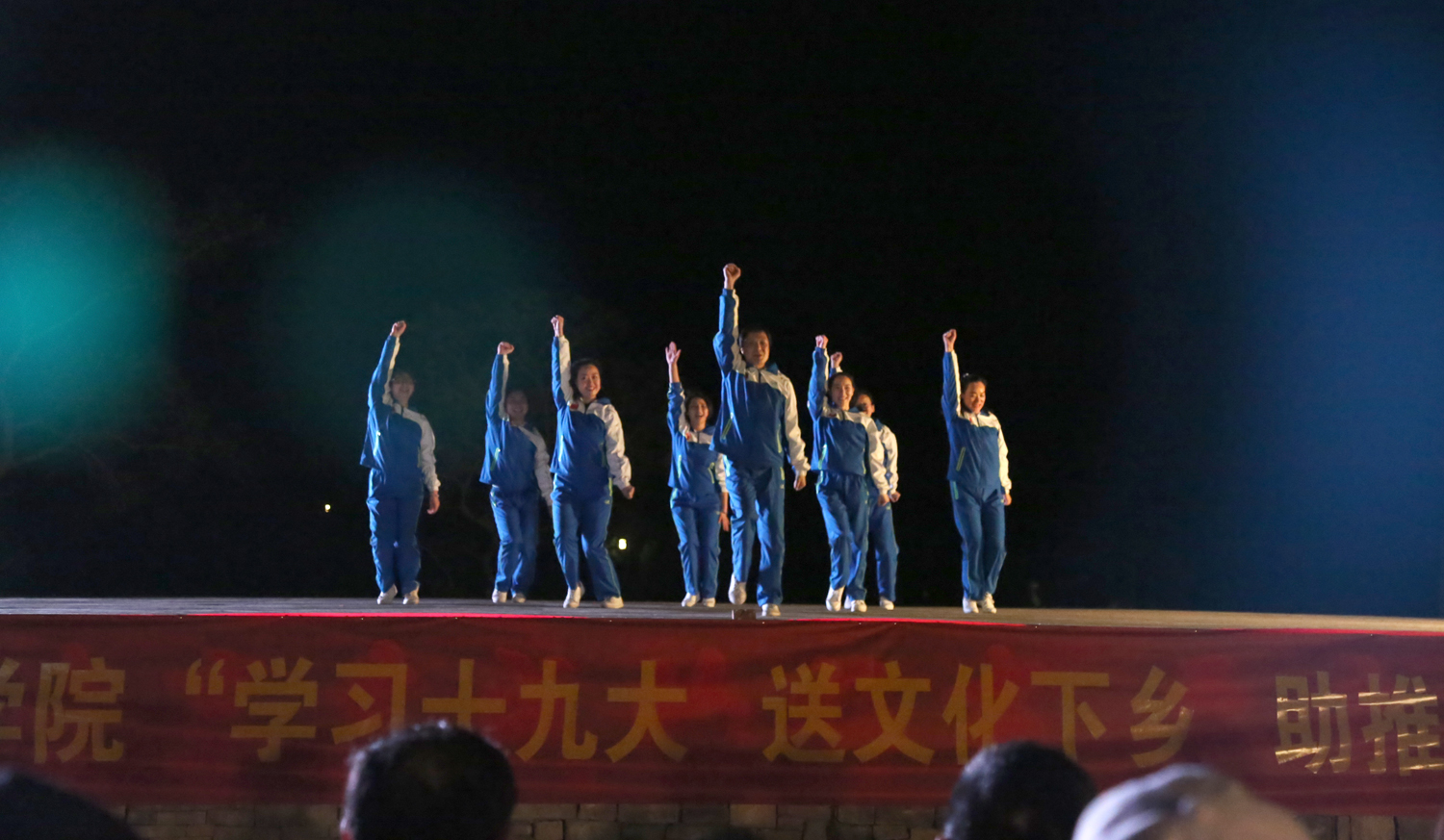 15日晚七点半,艺术学院“学习十九大,送文化下乡,助推精准扶贫”文艺演出在金岭村广场正式拉开序幕,学校党委副书记易三平、宣传部部长曹武平出席并观看了整场文艺演出。此前,艺术学院共派三批次学生骨干驻村带领当地村民学习广场舞、健身操等文体运动,极大丰富了当地群众文化生活。晚会现场,艺术学院30多名教师为群众热情演出啦啦操《健康踩踩踩》、萨尔萨舞蹈《大中国》、桑巴舞《打起手鼓唱起歌》、独舞《牡丹》和《奔腾》以及男女对唱《国家》,同时还邀请金岭村村民表演了广场健身操和舞蹈《最美中国人》,吸引了村内百余人前来观看,群众反响强烈,收到了良好的预期效果,许多群众希望以后像这种文艺活动能更多的在村里开展。