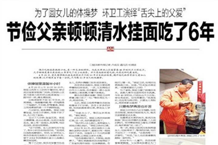 5月3号一篇名为《环卫工父亲6年吃了两吨清水挂面为女儿圆梦省钱》的文章,先后在楚天都市报、搜狐新闻、新浪新闻等网站中刊登转载。文章中的“女儿”侯杏杏出身在贫寒家庭,与吃挂面的父亲侯延卫相依为命;但是武汉体育学院的幼儿体操训练基地,却给了这个孩子一个在阳光下茁壮成长的机会。