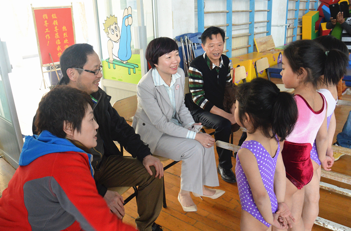 魏旭波向余小梅介绍了体操宝宝的发展前景,他说:“我校体操学院的学位一直设立到博士,还有国外来交流的博士研究生。这些孩子将来学有所成后一定大有作为,他们可以做教练、大学老师,也可以自主创业,还可以进企业工作等等。”