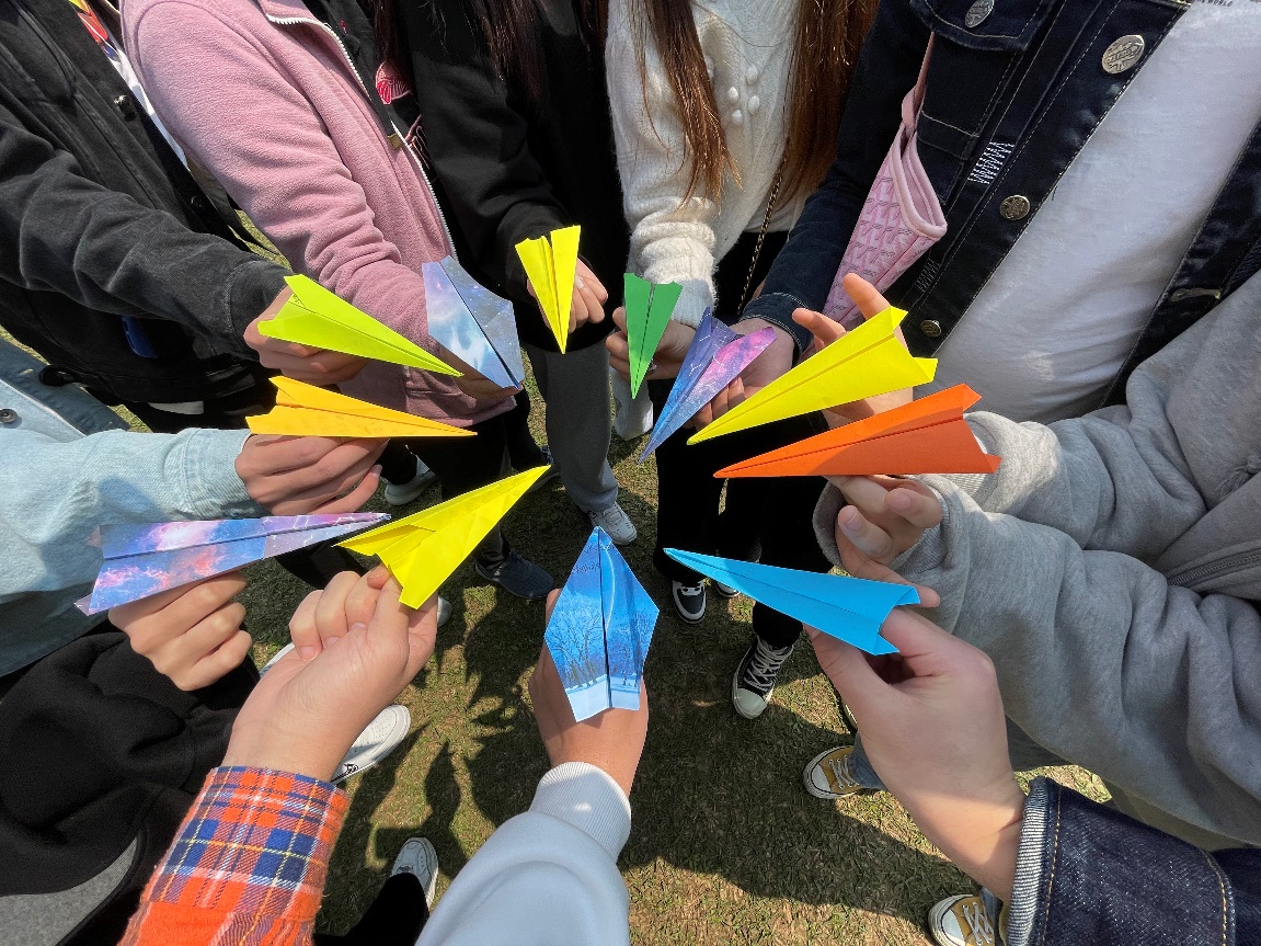 最后,大家在彩色卡纸上默默写下自己特别想实现的10个梦想,把它折成一个个纸飞机,一起在草坪上放飞。