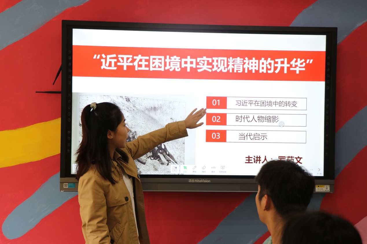 第三位分享人罗茹文同学带来《近平在困境中实现了精神升华》。她说道:习近平总书记说过,万事万物都有一个发展过程,每个人也都有一个历练和成长过程,没有“天生伟大”这一说。无论是平凡的人,还是伟大的人,他们都有一个共同点,就是热爱这个国家,愿意穷尽毕生为之而奋斗。她最后分享了舞蹈家吴晓邦成长中逆境的例子,勉励各位同学摒弃浮躁心态,从小事做起,从平凡着眼,慢慢积淀,成就伟大。