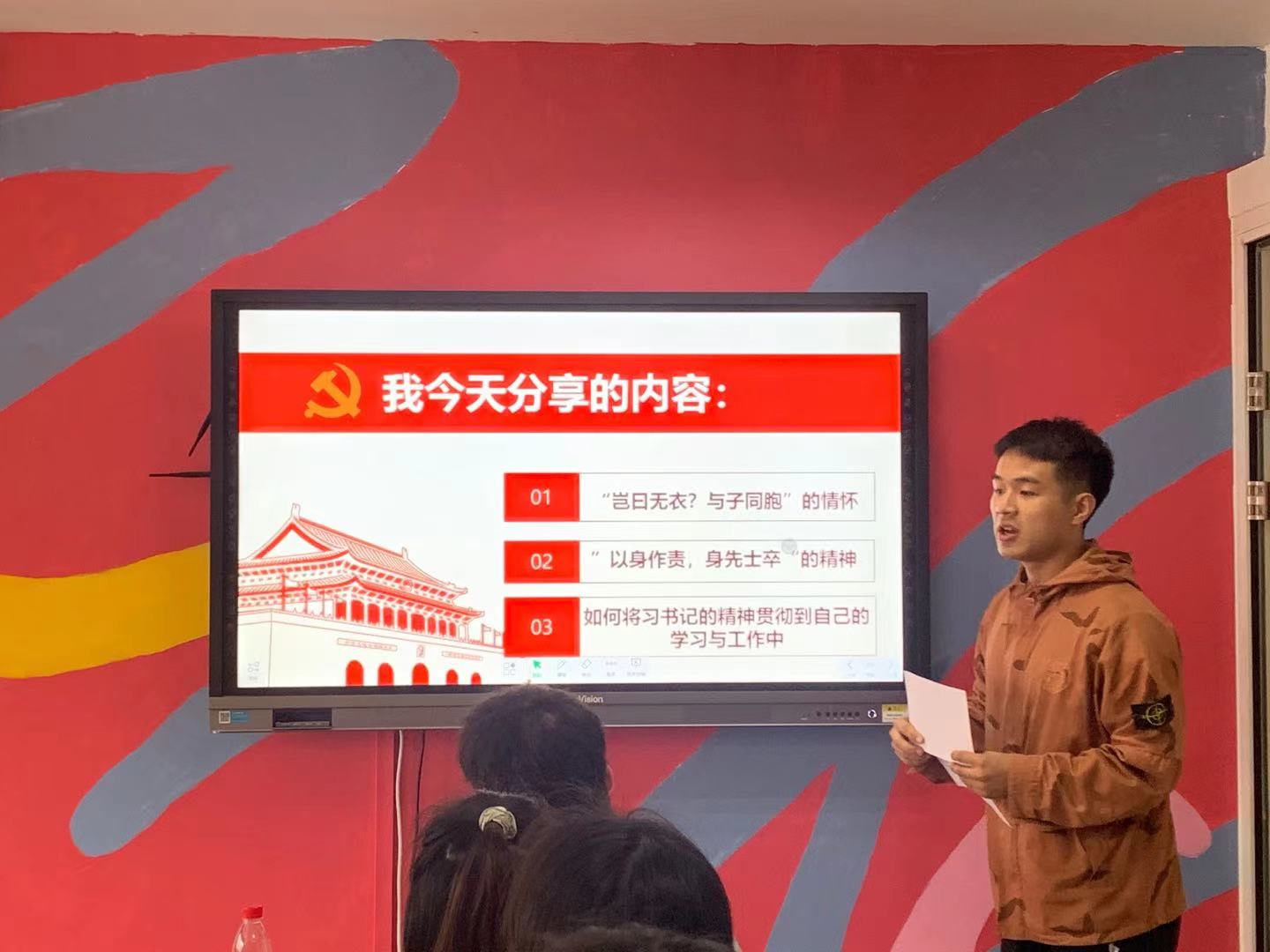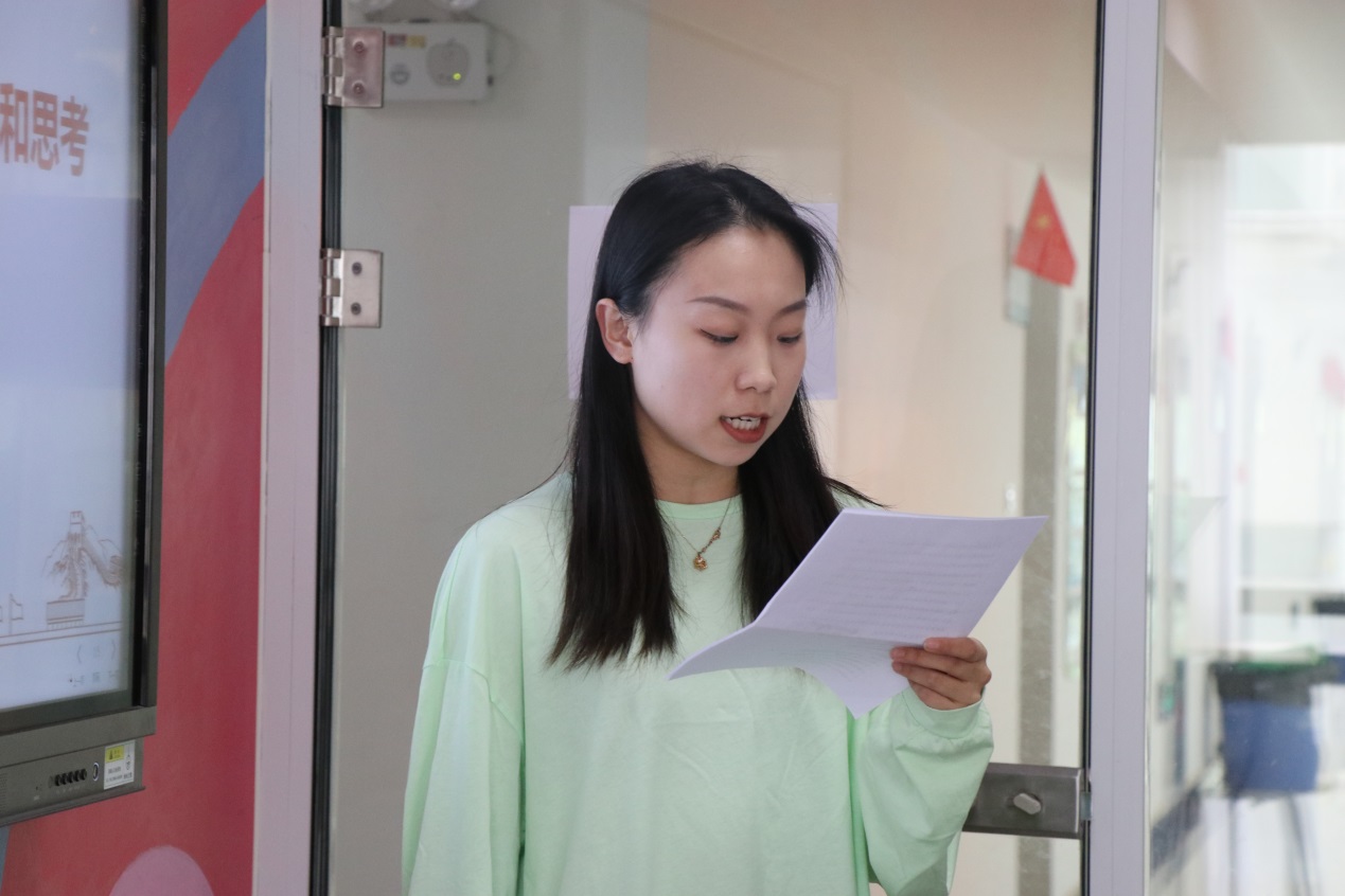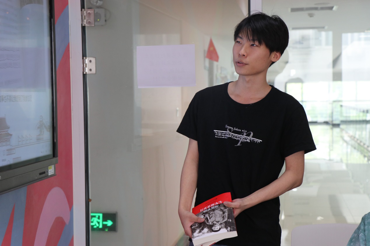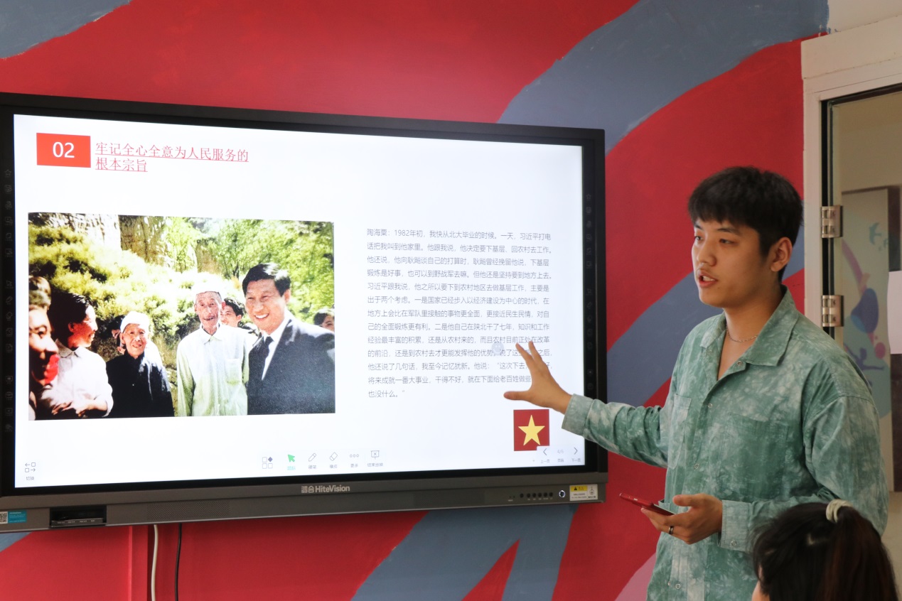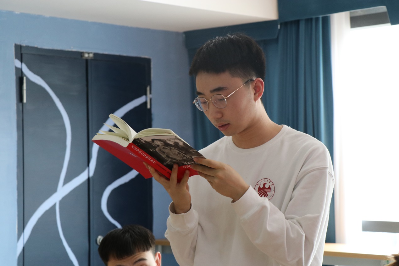 第一位同学王毓玮,他给我们分享了《近平把自己看作黄土地的一部分》。七年知青岁月,习近平把自己看作黄土地的一部分,同梁家河老乡们甘苦与共,用脚丈量黄土高原的宽广与厚度,一心只为让老百姓过上好日子。他说道,看到习近平总书记在自己身处困境时,仍能做到对乞食老汉解衣推食,他的人格和胸怀令人敬佩。