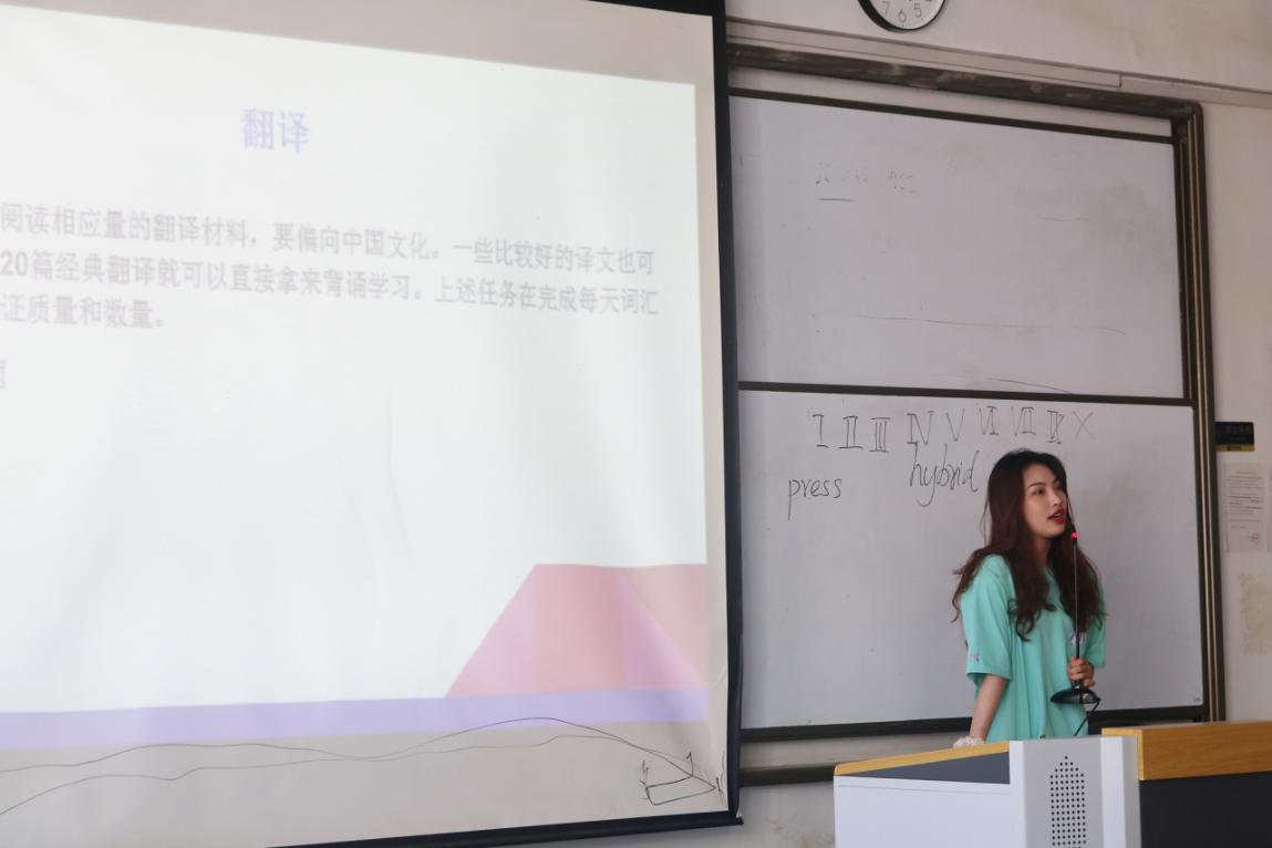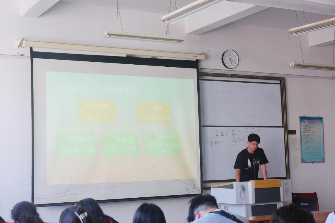 其次,雷中政同学向大家分享了他个人的英语四级考试经验,主要为以下几点:(一)英语四级的主要做题技巧——听力题运用“视听一致”原则;阅读题选择适合自己的做题顺序,不盲目;翻译题不追求长难句,能写多少写多少;写作题多背模板(二)考前最后几天的复习方法——回顾自己的错题,并分析做错的原因,整理错题逻辑,避免再犯。(三)考前注意事项——自带考试工具和“三证”,并建议考试前半小时入场。