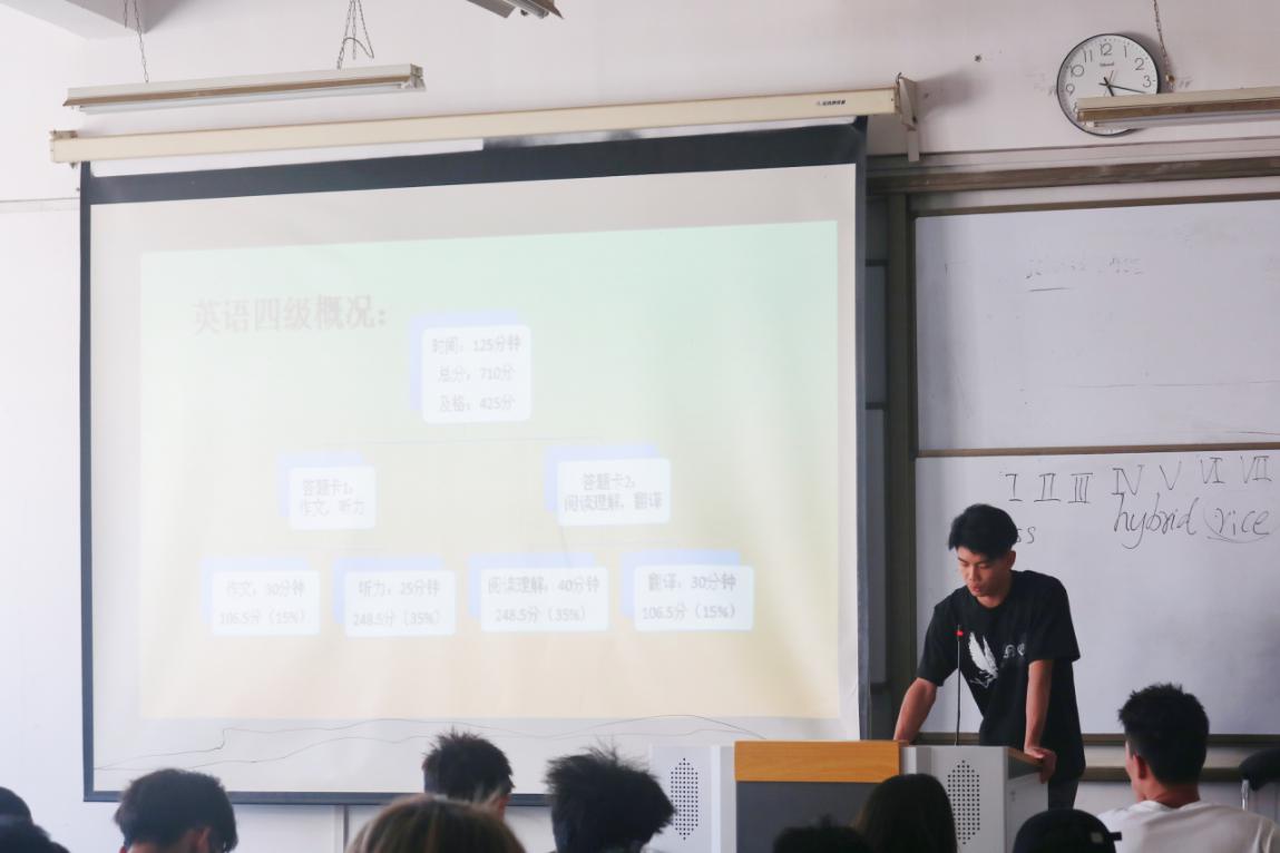 班会主要围绕“英语四级心得”展开讲述。首先,许秦同学结合PPT向大家讲述了英语四级的考试流程。详细的阐述了试卷结构、考试内容、考试题型、分值比例以及考试时间,让同学们更加清晰的知道英语四级要考什么题型,如何正确的安排有限的考试时间,考取更加优异的成绩。