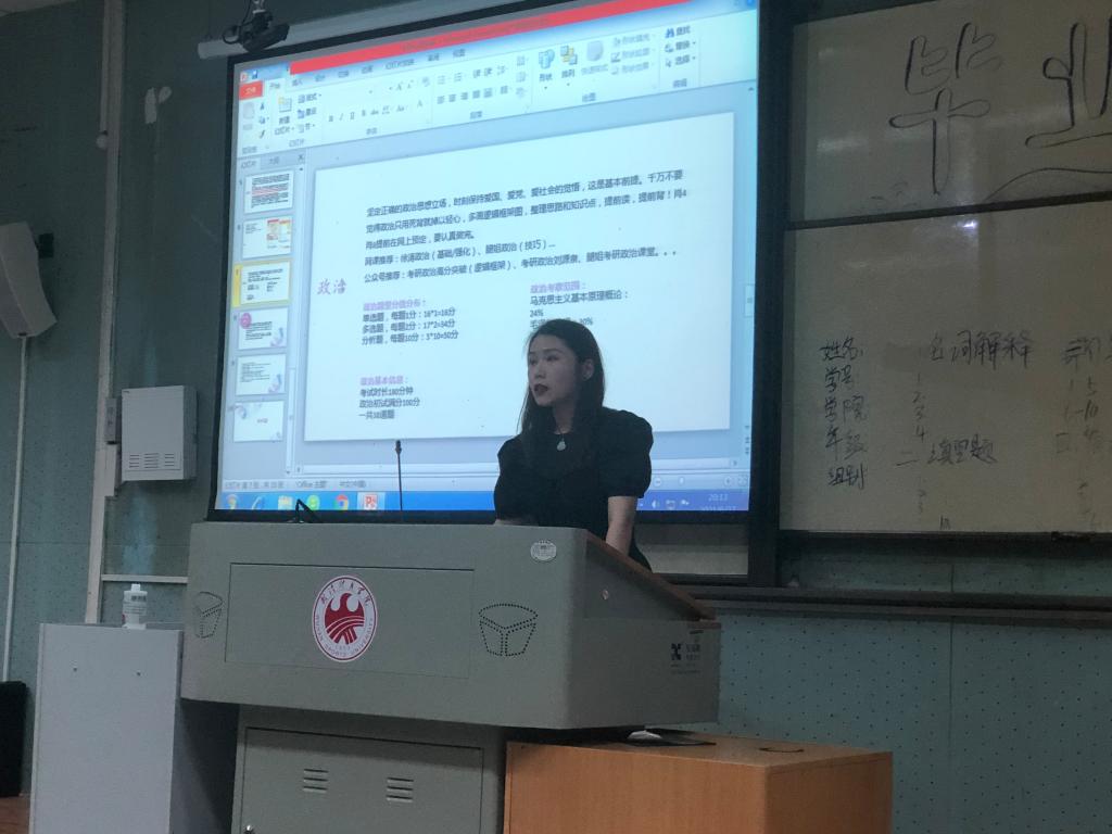 崔晓惠同学传授了公共课英语和政治的复习方法。首先,她指出单词是英语的基础,考研词汇至少要过四轮以上才比较稳妥,她建议基础较差的同学早做准备。阅读理解部分应该回归真题,作文部分勤练笔形成自身模板。最后,她指出考研是一场持久战,一靠毅力,二靠坚持,三靠自律。既然选择了这条路就要坚持到底,不逼自己一把或许永远不知道自己的潜力。那些你现在正面临的困难,将在日后成为回首过去最好的风景。