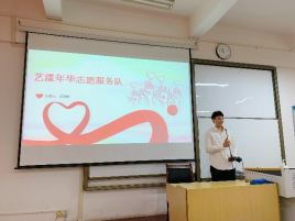 艺漾年华志愿服务队队长王柯新同学讲述了“艺漾年华”的历史由来以及团队构架,分享了组织参加志愿活动的经历和经验,普及了加入志愿汇的教程,让同学们进一步了解到“一月的严寒,七月的酷暑,蝉鸣,蛙语,寒风,暴雪都能见到他们的身影”的真正意义。