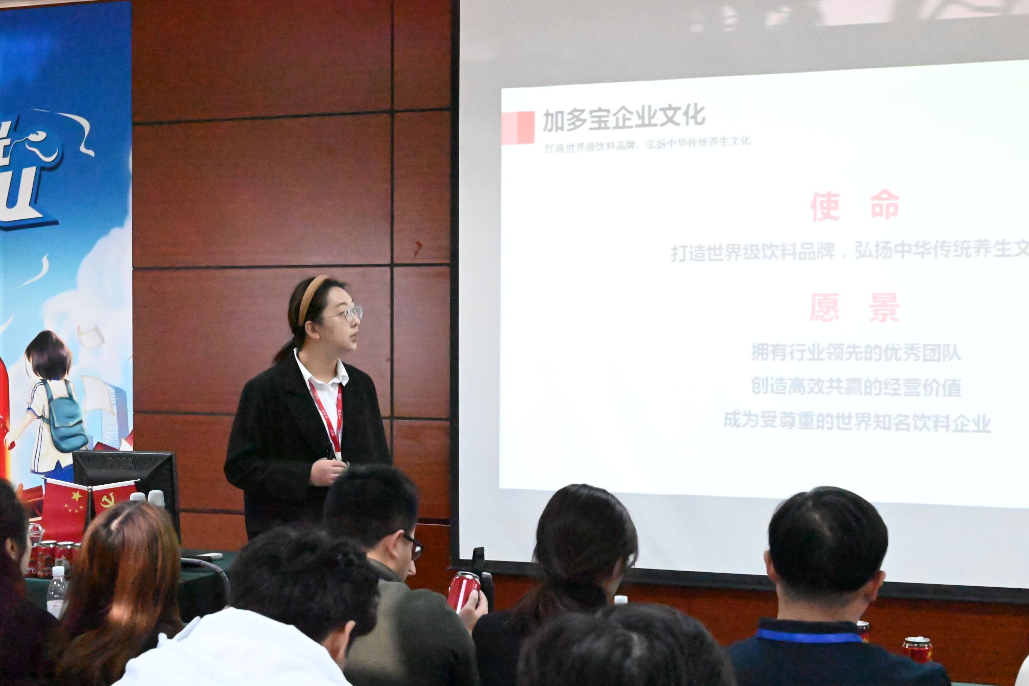 参观结束后,武汉加多宝工业园负责人张莹莹围绕企业文化、人才培养、社会责任三个方面为学生们开展讲座。她介绍了加多宝企业的“二次启程”的品牌故事,并针对“请进来”和“走出去”的校企合作方式和“飞鹰计划”管培生项目进行具体阐述。在交流环节,同学们增强了对民族企业的认同感与文化自信,并积极踊跃地为加多宝企业提出改良建议。