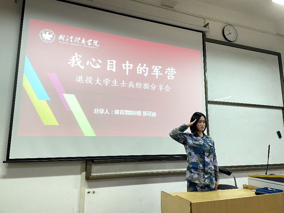 随后,艺术学院21级二部体育舞蹈6组的张可涵同学展开了以“我心目中的军营”为题的退役大学生士兵经验分享会。
